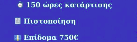 Κατάρτιση διάρκειας από 80 έως 150 ώρες ανάλογα την ειδικότητα που θα επιλέξετε (30-45 ώρες σύγχρονης & 105-130 ασύγχρονης εκπαίδευσης).